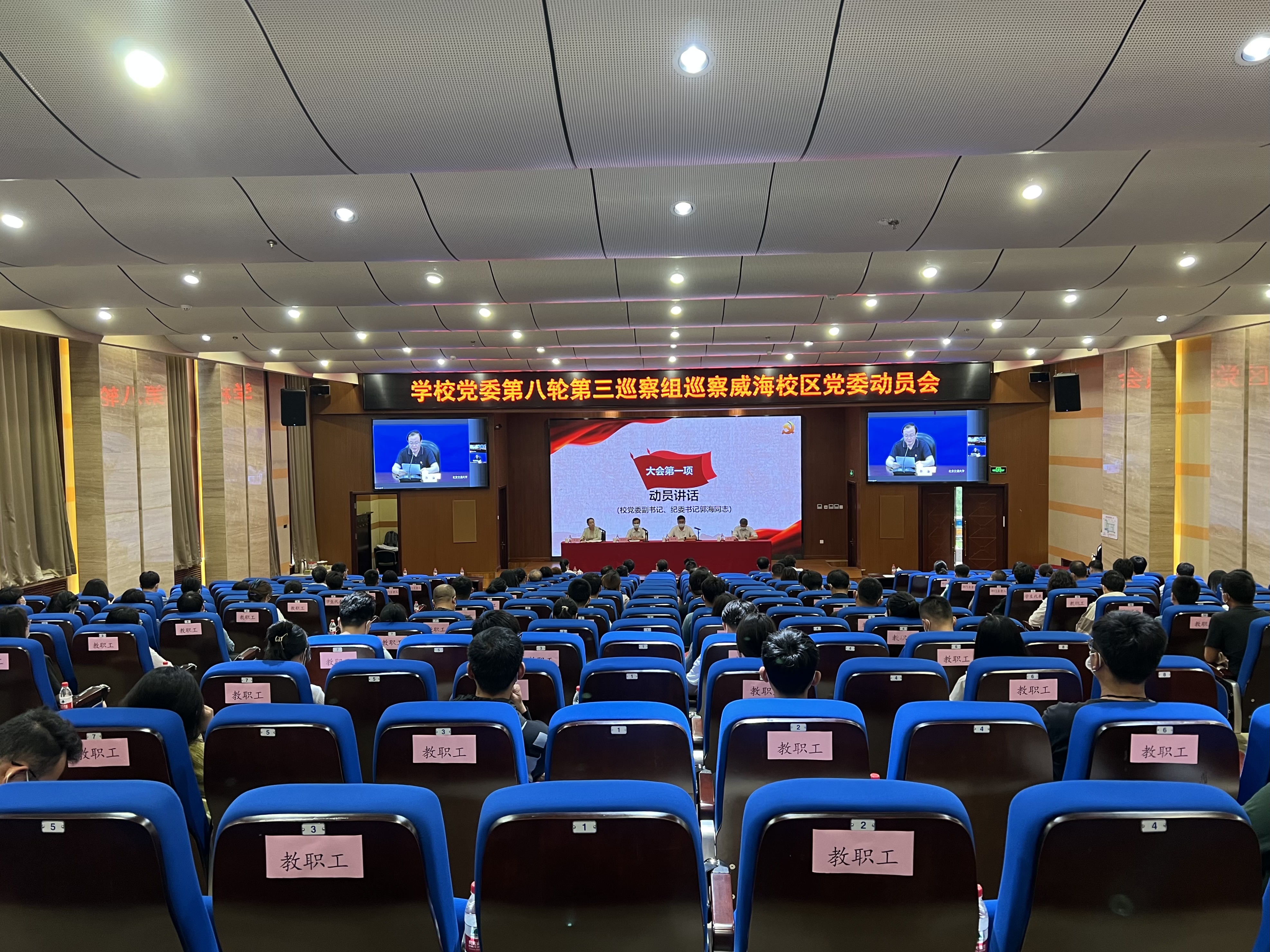 2022年6月20日下午,北京交通大学党委第八轮第三巡察组巡察威海校区党委动员会在学术交流中心报告厅顺利召开。校党委副书记、纪委书记郭海,校纪委副书记、巡察办公室主任王宏军,校党委第三巡察组组长杜永平,副组长陈磊,以及巡察组全体成员出席动员会议。威海校区党委书记孙文博等全体班子成员、党委委员、全体教职工以及学生代表等参加会议。大会由威海国际学院院长刘颖主持。